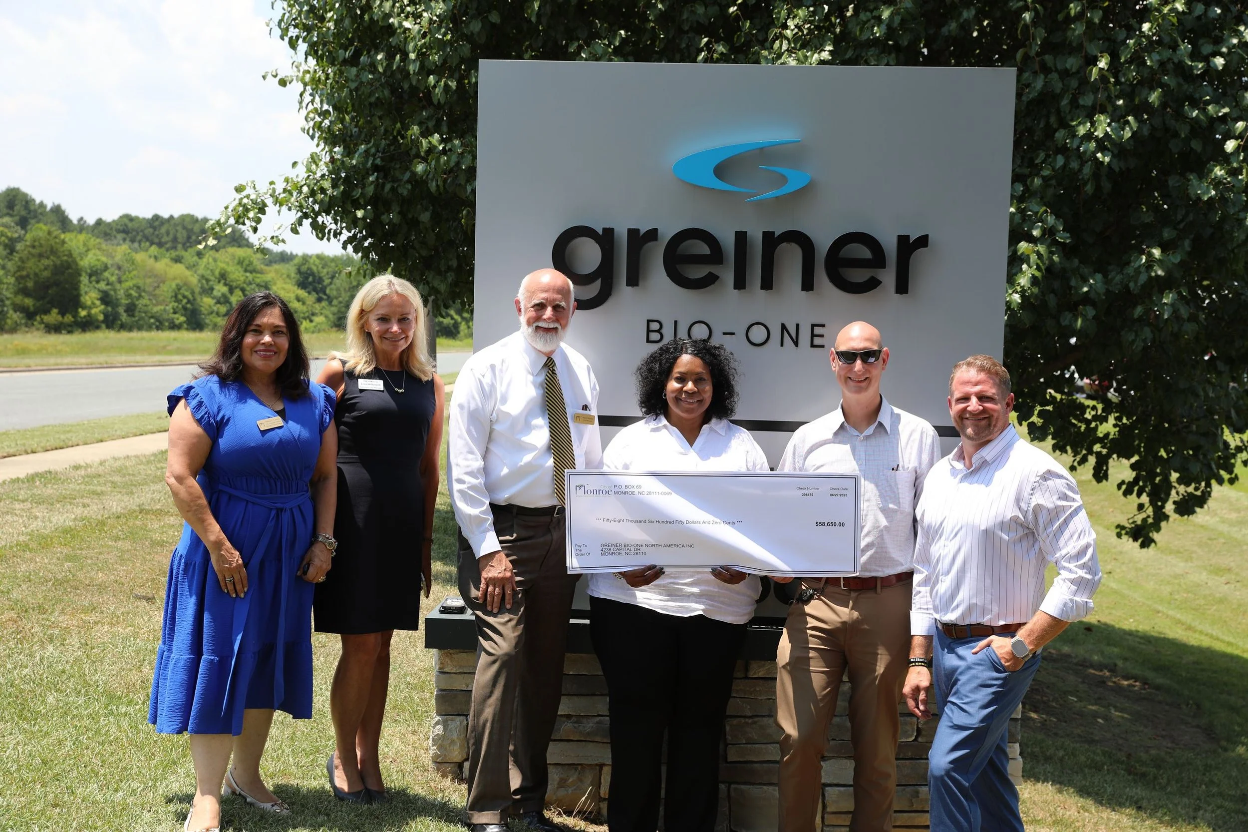The City of Monroe presented an economic development incentive check for $58,650 to Greiner Bio-One North America Inc., recognizing the company’s continued investment in its Monroe facility and fulfillment of its ongoing development agreement with the City. This is the fourth of five payments under the agreement.